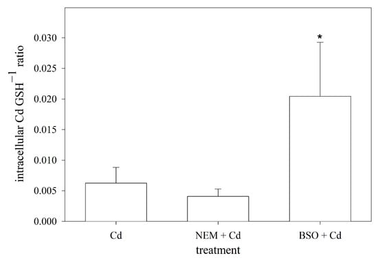 When exposed to Cd, the primary and most prevalent complex formed with GSH is Cd(GS)2 []. Assuming that two GSH molecules are required to sequester one Cd ion in RTG-2 cells, the cellular ratio of Cd to GSH was calculated using the measured intracellular concentrations of both. By doing so, the data showed that the blocking of the sulfhydryl groups by NEM did not affect the intracellular Cd:GSH ratio compared to the non-manipulated cells. The depletion of the intracellular GSH levels, on the other hand, resulted in a significantly higher cellular Cd:GSH ratio compared to the normal RTG-2 cells (Figure 5).