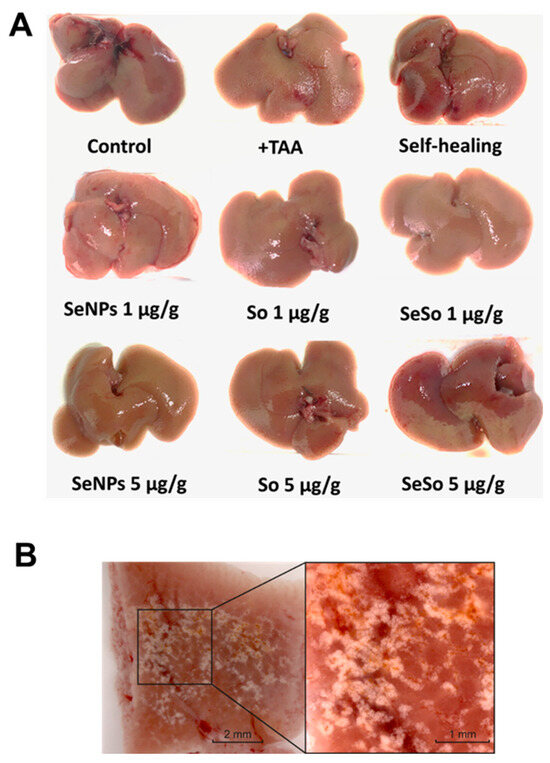 Macroscopic analysis of liver samples, shown in Figure 5A,B, indicated numerous inclusions of connective tissue in the livers of mice treated with TAA, which indicates that there were pathological disturbances in the architectonics of the liver and the formation of fibrotic changes in it.