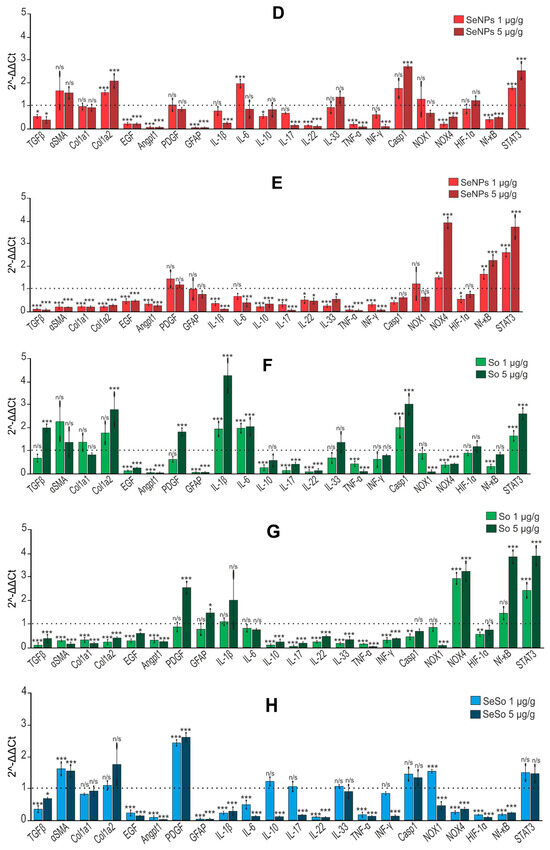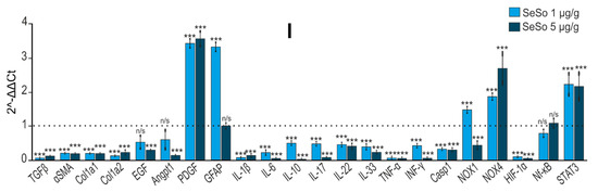 Relative levels of mRNA expression of pro- and anti-inflammatory and pro- and anti-fibrotic genes obtained by real-time PCR. (A) After TAA injections in relation to control; (B) effect of self-healing in relation to control; (C) effect of self-healing in relation to TAA; (D) after injections of SeNPs (1 and 5 µg/g) relative to control; (E) after injections of SeNPs (1 and 5 µg/g) relative to TAA; (F) after injections of So (1 and 5 µg/g) relative to control; (G) after injections of So (1 and 5 µg/g) relative to TAA; (H) after injections of SeSo (1 and 5 µg/g) relative to control; (I) after injections of SeSo (1 and 5 µg/g) relative to TAA. Mean values ± standard errors (SEs) were determined by analyzing data from at least three independent experiments and are indicated by error bars; n/s—data not significant; (p > 0.05), * p <0.05, ** p < 0.01, *** p < 0.001.
