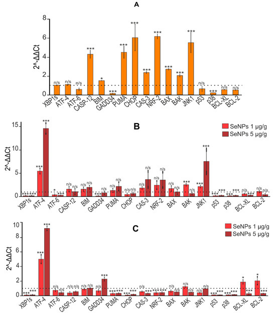 To understand the therapeutic effect of selenium-containing nanoparticles at the molecular level, we examined changes in mRNA expression patterns and the amount of protein they encode, primarily focusing on markers of ER-stress. We have repeatedly shown that various versions of selenium nanoparticles, as well as other organic and inorganic selenium-containing compounds, are capable of exerting cytotoxic effect in cancer cells through the regulation of the expression of these markers [14,27]. Such regulation is varied and is largely determined by the nature of the selenium-containing agents, the concentration used, and the origin of the cancer cells [65,66,67,68]. Based largely on our previous results, in this work, we checked how the mRNA expression of key markers of the PERK signaling pathway UPR (ATF-4), IRE1α signaling pathway UPR (XBP1s), and ATF-6 signaling pathway UPR (ATF-6) changed. In addition, the expression patterns of a number of genes that are involved in the adaptive response and pro-apoptotic signaling cascades associated with ER-stress were screened.