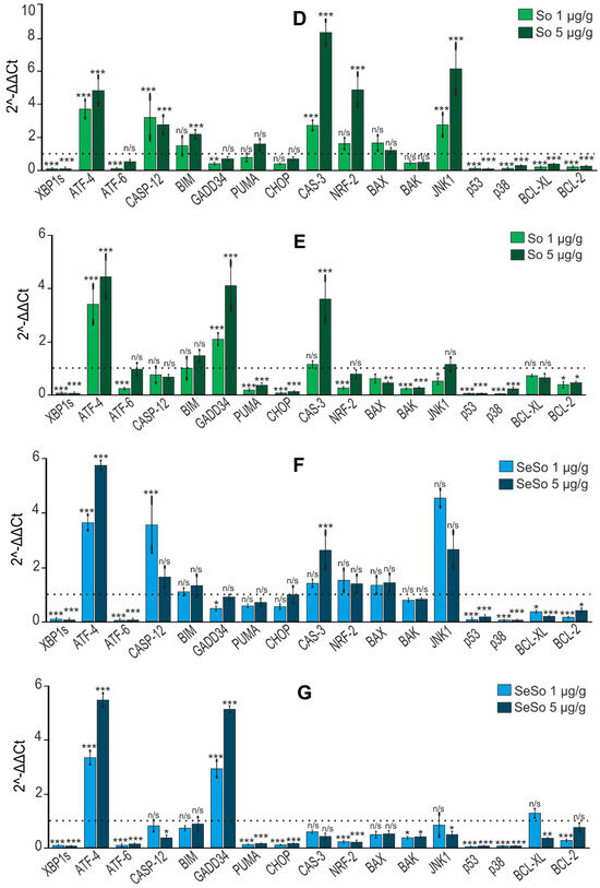 Relative levels of mRNA expression of ER-stress markers obtained by real-time PCR. (A) After TAA injections in relation to control; (B) after injections of SeNPs (1 and 5 µg/g) relative to control; (C) after injections of SeNPs (1 and 5 µg/g) relative to TAA; (D) after injections of So (1 and 5 µg/g) relative to control; (E) after injections of So (1 and 5 µg/g) relative to TAA; (F) after injections of SeSo (1 and 5 µg/g) relative to control; (G) after injections of SeSo (1 and 5 µg/g) relative to TAA. Mean values ± standard errors (SEs) were determined by analyzing data from at least three independent experiments and are indicated by error bars; n/s—data not significant; (p > 0.05), * p < 0.05, ** p < 0.01, *** p < 0.001.