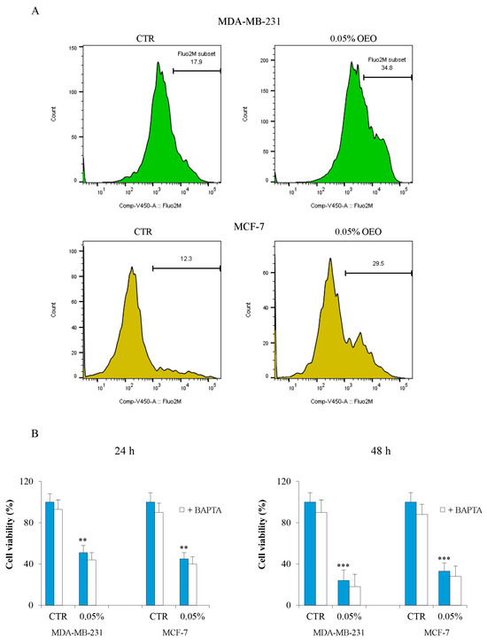 Figure 5. OEO treatment increased the intracellular calcium level. (A) MDA-MB-231 and MCF-7 cells were treated with 0.05% OEO for 24 h and 48 h. Variation in the content of intracellular calcium was evaluated by flow cytometry using Fluo 2-AM fluorochrome as reported in Section 2. (B) Effects of OEO/BAPTA treatment on cell viability. Cells were treated with 0.05% OEO without or with 5 µM BAPTA for 24 h and 48 h. Cell viability was assessed by MTT, as described in Section 2. In (B), values are the means of three independent experiments ± S.D. ** p < 0.01; *** p < 0.001 vs. untreated control.