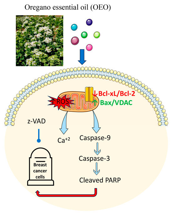 Our study was designed to investigate the biochemical mechanism by which OEO obtained by Sicilian Origanum vulgare L. induces cell death in MDA-MB-231, a triple-negative breast cancer (TNBC) cell line, and MCF-7, a breast cancer (BC) cell line responsive to estrogen. We also evaluated OEO phytochemical composition using HPLC/MS (high-performance liquid chromatography/mass spectrometry) analysis. Our study demonstrated that OEO induced apoptosis in both breast cancer cell lines through the involvement of mitochondria and caspase activation.