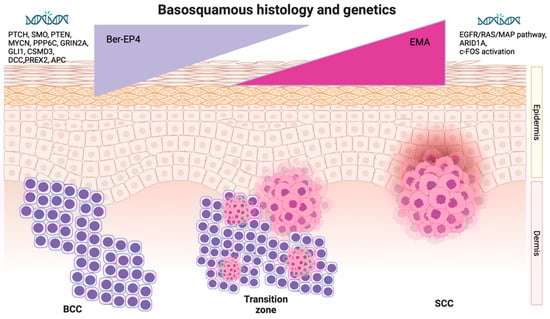 Numerous authors have proposed that the transition from basal to squamous cell carcinoma (BST) originates from epigenetic modifications [48]. The etiopathogenesis of BST remains a complex and debated matter, with potential involvement of various drivers and inducers such as SMO inhibitors (SMOi), activation of transcriptional inducers like c-FOS, and subsequent mutations such as ARID1A. Preclinical studies indicate that inhibiting SMO can prompt the shift of basal cell carcinoma to squamous cell carcinoma by promoting c-FOS activation of the EGFR/RAS/MAPK pathway. Conversely, inhibiting EGFR can reverse the effects of this transition [47,48]. More extensive research efforts are still required to fully understand this phenomenon. Figure 1 shows basosquamous histological, immunohistochemical, and genetic features.
