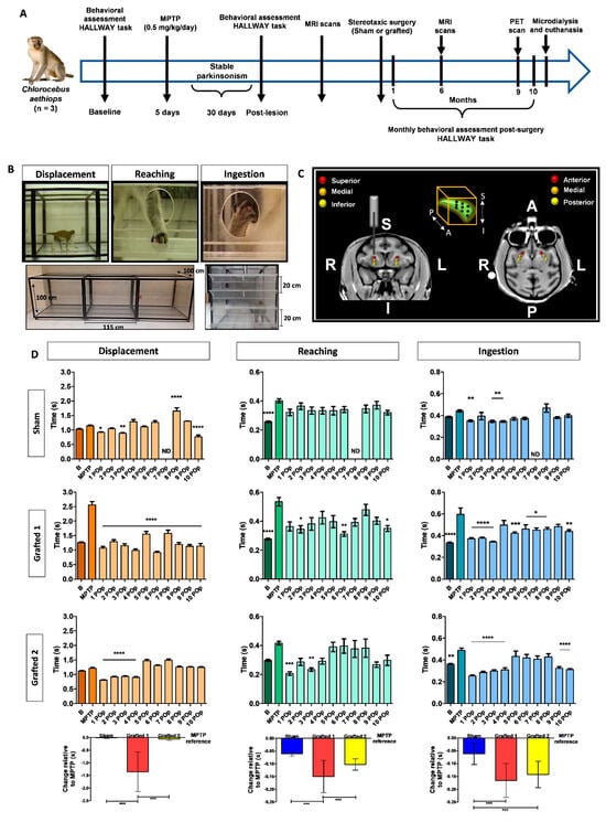 Parkinsonian motor symptoms were rated using the HALLWAY task previously reported to evaluate the free movements of NHPs [4,5]. Sessions were video recorded daily for five consecutive days. For each monkey, two observers blind to treatment scored motor performance independently. An evaluation session consists of placing two rewards on the lowest shelf just in front of the two holes in the acrylic wall at the end of the hallway; the NHP had to walk through the entire hall to take the reward from this shelf. The NHP was conditioned to return to the beginning of the hallway, and then two additional rewards were placed on the second shelf, repeated for the third and fourth shelves. The second round of the task consists of placing the rewards displaced to the middle of the shelf, forcing the monkeys to use each hand independently to take the reward. In the first round, the primate must return to the beginning of the hallway after taking the rewards from the lowest shelf to place the second, third, and fourth shelves rewards, respectively. Finally, the third round consists of placing four more rewards, one by one, in a well located on the right side of the second shelf to force primates to use a fine grip to take the rewards. Therefore, NHPs had to cross 12 times to take 20 rewards for a successful task. After training, the baseline was recorded for 5 days once the subjects performed more than 95% of the task in less than 10 min. After MPTP intoxication, NHPs had a one-month parkinsonism stabilization period since it is reported that after one month, there is no behavioral improvement even in extended periods, up to 2 years [3,14,16,35,59]. Then, we evaluated the behavioral task for five days. From this point onwards, each session of the hallway task ends when the primate takes all the rewards or after 10 min. After sham or grafting surgery, the animals were evaluated for 5 days monthly, over 300 days (Supplementary Videos). The analysis of the videos consisted of frame-by-frame quantifications of three motor behavioral parameters: (1) Displacement: time to cross the second third of the hallway (1.15 m), (2) Reaching: time to take the rewards, and (3) Ingestion: time to bring the reward to the mouth.