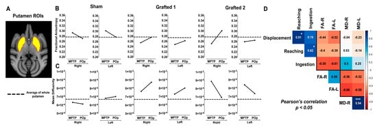 FA and MD measurements in MPTP-treated NHPs after sham surgery or DAN transplantation. (A) MRI template and ROI of putamen. (B) FA and (C) MD quantification in Sham and Grafted NHPs in bilateral putamen in MPTP condition and post-operative (POp), respectively. Reference dotted lines represent the average FA and MD of whole putamen in the healthy group. The black lines represent the average FA and MD of the anterior, medial, and posterior putamen of each subject. (D) Pearson’s correlation matrix between the unilateral FA and MD of the whole putamen with the behavioral scores (displacement, reaching, and ingestion) of all NHPs in both MPTP and POp (average values from months 1 to 6) conditions. * p < 0.05, *** p < 0.001. FA-R, Fractional anisotropy right; FA-L, Fractional anisotropy left; MD-R, Mean diffusivity right; MD-L, Mean diffusivity left.