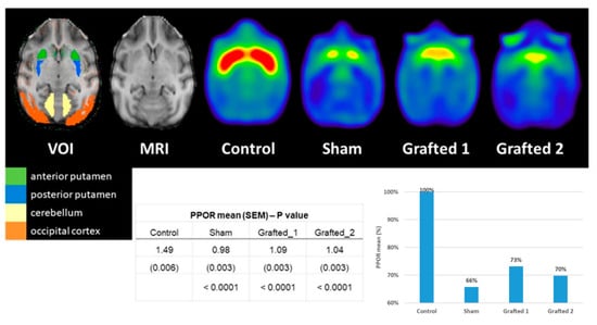 We performed 11C-DTBZ PET scanning to assess the presence of DA nerve terminals due to an incomplete lesion or to detect somata of grafted DANs in the putamen. The 11C-DTBZ PPOR was lower in Sham than in Control, and its binding in Grafted 1 and Grafted 2 was greater than in Sham (Figure 4). These data revealed that Grafted NHPs, at 9 months post-surgery, had increased 11C-DTBZ binding in both putamina, indicative of functional DANs at the transplanted site, similar to changes in clinical trials using DANs from induced pluripotent stem cells [18].