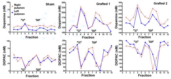 Tissue disruption of the probe caused altered neurotransmitter levels, but after 10 min, the values returned to normal, even in human patients [84]. Microdialysis probes were perfused with artificial cerebrospinal fluid at 2 μL per minute for 1 h for tissue stabilization as reported [29,84,85,86] and fractions were collected every 12 min. Monoamines were stabilized by adding 0.1 N of perchloric acid, 0.02% EDTA, and 1% ethanol. Extracellular DA increases were obtained after three basal fractions through bilateral chemical depolarization (isosmotic solution containing 100 mM of KCl, fraction 4) or 30 μM of amphetamine (fraction 8) and quantified for monoamine content by HPLC. No recovery correction was performed. After histological analysis, we found that all microdialysis probes were in the putamina, close to the grafting sites (Figure 6A, left panel).