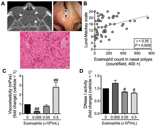 Eosinophilic mucin in ECRS. (A) CT scan of the ethmoid sinus (upper-left panel), as well as intranasal endoscopic (upper-right panel) and histological (hematoxylin and eosin staining; 400× magnification, lower panels) findings of mucin. Scale bars in the bottom-right corner indicate 20 μm. Arrow heads indicate mucin. (B) Correlation between eosinophil count in nasal polyps and sinus CT score (Lund–Mackay scale) in ECRS. The individual values of 56 subjects are shown. (C) Viscoelasticity of mucin was evaluated using a viscometer 72 h after the co-incubation of mucin and purified peripheral blood eosinophils. (D) The overnight co-incubation of BEAS-2B cells and purified eosinophils, DNase I in cell extracts of BEAS-2B was assayed. Values represent the means ± SEM values of four experiments. # p < 0.05, ## p < 0.01 (vs. without eosinophils).