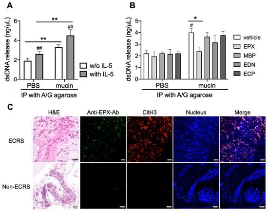 Igs-induced dsDNA release from eosinophils. Purified peripheral blood eosinophils were incubated on the plate coated with Igs in the immunoprecipitate of mucin supernatants. (A) Concentrations of dsDNA were released from eosinophils with or without IL-5 (10 ng/mL). (B) Igs on the plate were reacted with eosinophil granule proteins (eosinophil peroxidase, EPX; major basic protein, MBP; eosinophil-derived neurotoxin, EDN; eosinophil cationic protein, ECP; 1 µg/mL) 2 h before eosinophils were added. Values represent the means ± SEM values of four experiments. # p < 0.05, ## p < 0.01 (vs. PBS without Igs); * p < 0.05, ** p < 0.01 (as shown between the two groups). (C) Autoimmune antibodies against EPX in eosinophilic mucin from patients with ECRS (upper panel). Proteins bound to EPX (anti-EPX antibody, green), citrullinated histone H3 (CitH3, red), and nucleus (blue) are stained with hematoxylin and eosin (H&E). Non-eosinophilic mucin from patients with CRS (non-ECRS) (lower panel) was used as a control. Images are shown at 400-fold magnification, and scale bars in the bottom-right corner of Merge indicate 20 μm. Data are representative of at least three independent experiments.