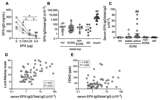 EPX-specific IgG levels in ECRS. (A) Neutralization of EPX-IgG in mucin supernatant. EPX-IgG levels measured using our original ELISA system decreased with the addition of recombinant EPX in dose-dependent manner. Individual values were shown (n = 4). # p < 0.05, ## p < 0.01 (vs. without EPX); * p < 0.05 (as shown between the two groups). (B,C) EPX-IgG levels in supernatant of nasal secretion (nasal sup) or mucin (B), and serum (C). Individual values in each group represent ratios to total IgG levels. Healthy volunteers (HV, n = 8), stable ECRS (eosinophilic chronic rhinosinusitis, n = 31), active ECRS (n = 23), non-ECRS (n = 8), AR (allergic rhinitis, n = 8), and mucin (n = 13, out of 23 active ECRS). ## p < 0.01 (vs. other groups). (D,E) Correlation between serum EPX-IgG levels and sinus CT score (Lund–Mackay scale) (D), and fractional exhaled nitric oxide (FENO) (E) in patients with ECRS. Individual values are shown (n = 54).
