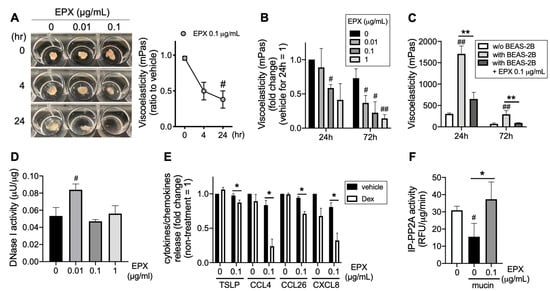 Effects of EPX on mucin decomposition. (A–C) Effect of EPX on mucin decomposition from patients with ECRS. Eosinophilic mucin was treated with EPX for up to 72 h (A,B). Mucin co-incubated with BEAS-2B cells was treated with EPX for up to 72 h (C). Mucin viscoelasticity was measured using a viscometer. (D) Effect of EPX on DNase I activity in airway epithelial cells. BEAS-2B cells were treated with EPX for 72 h. The DNase I activity in BEAS-2B cell extracts was assayed. (E,F) Effect of EPX on the ability of corticosteroid to inhibit TSLP, CCL4, CCL26, and CXCL8 (E), as well as phosphatase activity in immunoprecipitates with PP2A (IP-PP2A). BEAS-2B cells were co-incubated with eosinophilic mucin and EPX for 72 h. Values represent the means ± SEM values of four (A,D–F) or three (B,C) experiments. # p < 0.05, ## p < 0.01 (vs. time = 0 in A, without EPX in B and D, without BEAS-2B in C); * p < 0.05, ** p < 0.01 (as shown between the two groups).