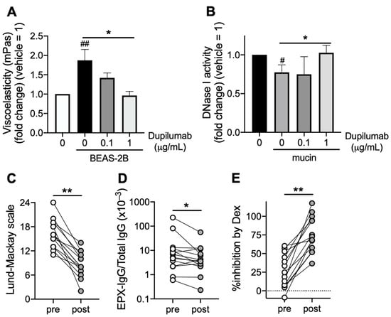 Effect of dupilumab on mucin decomposition. (A) Effect of dupilumab on mucin decomposition from patients with ECRS. Eosinophilic mucin co-incubated with BEAS-2B cells was treated with dupilumab for 24 h. The mucin viscoelasticity was measured using a viscometer. Control is mucin alone without BEAS-2B. (B) Effect of dupilumab on DNase I activity in airway epithelial cells. BEAS-2B cells co-incubated with eosinophilic mucin were treated with dupilumab for 24 h. DNase I activity in BEAS-2B cell extracts was assayed. Control is BEAS-2B alone without mucin. (C,D) Sinus CT score (Lund–Mackay scale, C) and serum EPX-IgG levels (D) were evaluated before (pre) and 4 months after (post) treatment with dupilumab. (E) The inhibitory activity by dexamethasone on TSLP and Poly(I:C)-induced CCL4 production (%inhibition by Dex) in BEAS-2B co-incubated with one in 10-diluted patients’ serum overnight was measured. Sera were obtained before (pre) and 4 months after (post) treatment with dupilumab. Values represent the means ± SEM values of four (A,B) experiments, and individual values (n = 14) are shown (C–E). # p < 0.05, ## p < 0.01 (vs. non-treatment control); * p < 0.05, ** p < 0.01 (as shown between the two groups).