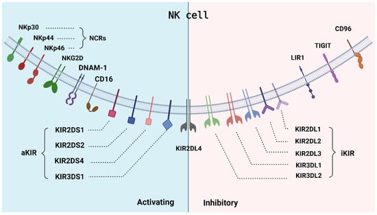 Natural killer cell signaling receptor repertoire. Natural killer cells are equipped with a diverse assortment of activating and inhibitory signaling receptors that mediate NK cell activity through combined signal propagation. Activating receptors, including NCRs, NKG2D, DNAM-1, CD16, and aKIRs transmit the signals to promote NK cell activation and cytotoxicity, while inhibitory receptors, including CD96, TIGIT, LIR1 and iKIRs, induce the inhibition signaling to block the NK cell activation. KIR2DL4 could introduce activating or inhibitory signaling into NK cells based on its content and ligands.