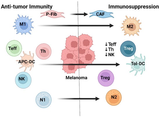 Functional shifts between anti-tumor immunity and immunosuppression within the tumor microenvironment. Several non-malignant immune and stromal cells undergo phenotypic alterations through direct cell-cell interactions with melanoma cells and through the influence of chemical conditions within the tumor microenvironment. M1: phagocytic macrophage phenotype. M2: pro-inflammatory macrophage phenotype. N1: cytotoxic neutrophil phenotype. N2: pro-inflammatory neutrophil phenotype. APC-DC: functional antigen-presenting dendritic cell. Tol-DC: dysfunctional tolerogenic dendritic cell. Teff: CD8+ cytotoxic T cell. Th: CD4+ pro-cytotoxic helper T cell. Treg: CD4+ immunosuppressive regulatory T cell. NK: natural killer cell. P-Fib: primary fibroblast. CAF: cancer-associated fibroblast.
