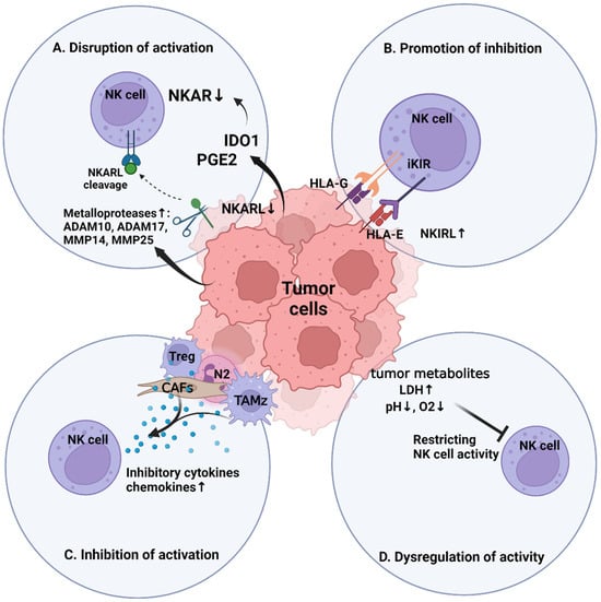 The four main mechanisms of immune escape. (A) Disruption of NK cell activation through at least three mechanisms: Tumor cells can express molecules such as IDO1 and PGE2 to mediate the inhibition of NKAR expression in NK cells. Also, tumor cells often downregulate the NKAR ligand expression on tumor cell surfaces or/and shed their NKAR ligands proteolytically. (B) Promotion of NK-inhibiting receptor-ligand interactions via upregulation of inhibitory ligand expression on melanoma cells. (C) Immune escape assisted by non-malignant constituent cells within the tumor microenvironment through secreted immunosuppressive cytokines and chemokines. (D) Immunological dysfunction resulting from hypoxic and acidic chemical conditions within the tumor microenvironment.