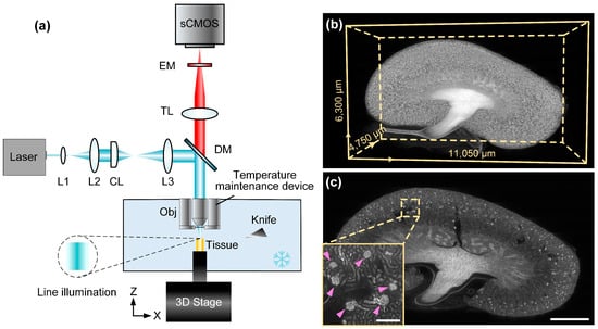The OCT-embedded kidneys were imaged with a Cryo-fMOST system. A brief system diagram is shown in Figure 1a. The imaging part was based on line-scanning microscopy. The laser beam from a CW diode laser (Cobolt 06-DPL 561 nm 100 mW, Hübner Photonics, Kassel, Germany) was expanded by a 4f system. The system consisted of two lenses (L1, AC050-008-A-ML, f = 7.5 mm and L2, AC254-250-A, f = 250 mm, Thorlabs, Newton, NJ, USA). The line illumination was formed by a cylindrical lens (CL, ACY254-100-A, f = 100 mm, Thorlabs, USA) and then transmitted through a lens (L3, AC254-125-A, f = 125 mm, Thorlabs, USA). The excitation beam was reflected on a dichroic mirror (DM, FF493/574-Di01–25×36, Semrock, Rochester, NY, USA) and focused on a target surface through an objective lens (LUCPLFLN 20×, NA = 0.45, Olympus, Tokyo, Japan). The excited fluorescence was filtered by DM and an emission filter (EM, FF01-620/52, Semrock Inc., USA), focused by a tube lens (TL, U-TLU, f = 180 mm, Olympus, Japan), and detected by a scientific complementary metal oxide semiconductor (sCMOS) camera (ORCA-Flash 4.0, Hamamatsu Photonics K.K., Hamamatsu, Japan). The x-y planes of the sample were obtained through line scanning, where the illumination line remained stationary and the sample was scanned by a 3D translation stage (X: XML210, Y: XMS100, Z: GTS30V, Newport, Irvine, CA, USA). After imaging, the translation stage moved the sample to the microtome (Diatome AG, Port, Switzerland) for removal of the imaged tissue. The process of imaging and sectioning was repeated until the entire kidney dataset had been acquired.
