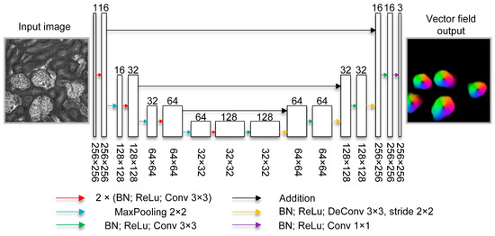 As shown in Figure 2, a lightweight U-shaped neural network was proposed for efficient gradient prediction in FastCellpose. The network consists of an encoder path and a decoder path. The encoder path is responsible for extracting abstract representations of the input data. This is achieved by stacking a series of encoding units. Each encoding unit contains two convolution layers, and each convolution layer is accompanied by a batch normalization (BN) layer [40] and a rectified linear unit (ReLU) layer. After two convolution operations, the output data goes through a max pooling layer in order to halve the image size. The output feature size for the first encoding unit (i.e., base feature size) is 16, and the subsequent encoding units steadily double the output feature size. The decoder path is responsible for recovering the hierarchy features extracted from the encoder path into the gradient vector field of the input image. Symmetric with the encoder path, a series of decoding units lie in the decoder path to gradually upsample the image to its original size. Each decoding unit contains a deconvolution and a convolution layer.