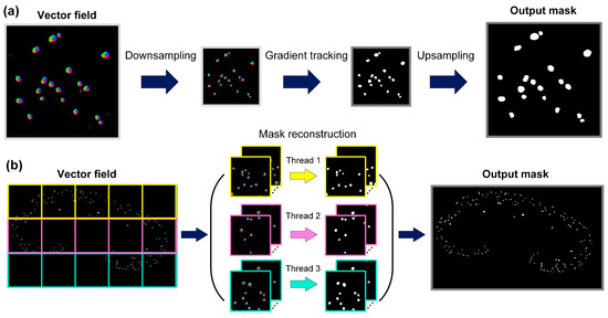 The optimized pipeline for mask reconstruction in FastCellpose. (a) We accelerated the gradient tracking process by downsampling the vector field and then upsampling the reconstructed mask. (b) We employed parallel computing to further accelerate the mask reconstruction process for whole x-y plane images.