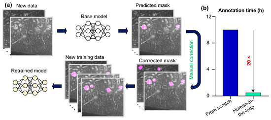 A human-in-the-loop approach for applying FastCellpose to accurately segment the kidney datasets of different ages. (a) Schematic of the human-in-the-loop approach. (b) Annotation time of the traditional (manual annotating from scratch) and the human-in-the-loop approach.