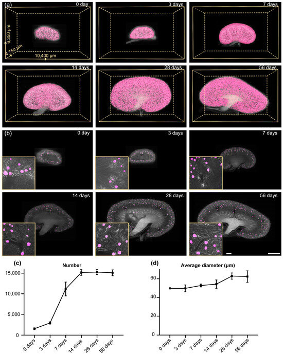 Glomeruli segmentation and analysis results of mouse kidneys of different ages. (a) Three-dimensional visualization of the segmentation results of mouse kidneys at different development stages. (b) Two-dimensional visualization of the segmentation results of mouse kidneys at different ages. Segmentation results (magenta) are shown overlaid with the original data. Scale bar, 1000 μm; 100 μm for the enlarged image. (c,d) The development curves of the mouse glomeruli. The number (c) and the average diameter (d) of glomeruli in mouse kidneys of different ages are exhibited.