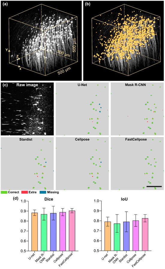 Application of FastCellpose in neuronal soma segmentation. (a) Three-dimensional visualization of a typical raw imaging stack from the neocortex in a Thy1-GFP mouse brain. (b) Segmentation results of FastCellpose for the imaging data are shown in (a). Segmentation results (orange) are shown overlaid with the original data. (c) Two-dimensional visualization of the segmentation results of different methods. Scale bar, 150 μm. (d) The Dice and IoU scores of the methods are shown in (c).