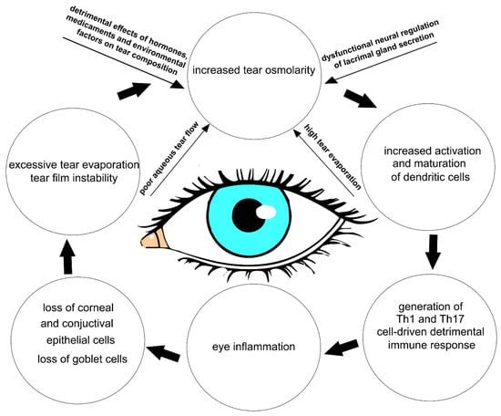 The multifactorial nature of DED encompasses a number of interconnected underlying pathologies, including a loss of homeostasis, instability and hyperosmolarity of the tears, and the induction and propagation of detrimental inflammatory responses in the eyes, which finally results in the development of neurosensory dysfunction and visual disruption [1,5]. These detrimental events create a “pathological loop” that promotes the development and exacerbation of DED (Figure 1) [1].
