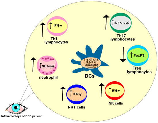 Detrimental immune response in the eyes of DED patients. Increased expressions of MHC proteins and co-stimulatory molecules were noticed in eye-infiltrated DCs of DED patients. DCs of DED patients have increased capacities for the production of inflammatory, pro-Th1 (IL-12), and pro-Th17 cytokines (IL-1β, IL-6, IL-12, IL-23), crucially contributing to the generation of detrimental Th1 and Th17 cell-driven immune responses. Accordingly, an increased number of IFN-γ-producing Th1, NK, and NKT cells and an increased number of IL-17- and IL-22-producing Th17 cells were observed in the eyes of DED patients. Additionally, THO promotes NETosis in eye-infiltrated neutrophils, importantly contributing to the progression of DED.
