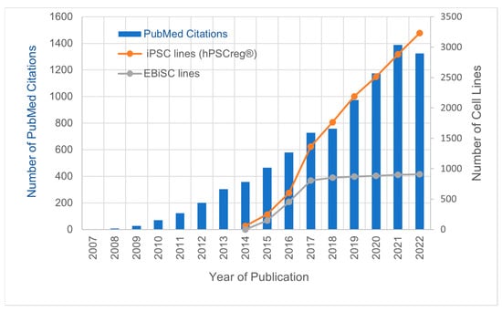 Since the ground-breaking discovery of induced pluripotent stem cells in 2006 [1] research and development based on these pluripotent stem cells have steadily increased, as demonstrated by the rising number of PubMed citations since 2007 (Figure 1). Concurrently, the number of human iPSC (iPSC) lines generated worldwide is continuously growing, as evidenced, for example, by iPSC line registrations in the globally accessible registry for existing human pluripotent stem cell lines (hPSCreg®; https://hpscreg.eu, accessed on 13 January 2023; Figure 1). Thus, iPSCs have become indispensable research tools for modelling human development, disease modelling, and drug discovery, to name but a few applications. The rapid increase in iPSC application is driven by progress in stem cell technologies, such as easy-to-use kits, which make reprogramming widely accessible to cell biology laboratories. Advances in automation have the potential to further revolutionize downstream iPSC applications by increasing scale and reproducibility while minimizing the cost of reprogramming, expansion, and iPSC differentiation. As many academic, clinical, or institutional cell line generators are not necessarily experts in biobanking, they may not be able to guarantee reproducible quality and maintain high standards over longer periods of time. Thus, the inherent risks of local banking include the loss of samples, quality, and knowledge about relevant data. In addition, smaller projects often generate small groups of lines for internal research, which are, nevertheless, of high value for the wider community. Patients, especially those with rare or intractable diseases, are increasingly eager to donate their biological material for research, including for the generation of iPSC lines. Their main interest is to make their donated samples and derivative tools available for researchers throughout the world. Biobank infrastructures offer the prerequisite expertise, facilities, and qualified personnel to bank biological materials. Moreover, iPSC generation and local storage require the management of cells and data over years to maintain the utility of the cells, which is cost-intensive [2]. Large biobanks (Table 1) are able to implement and maintain standards, guarantee reproducible quality at scale, and, thus, mitigate the overall costs per line to make iPSC lines broadly available.