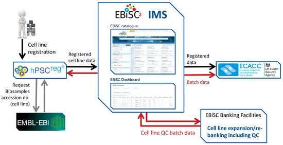 Graphical overview of the EBiSC data flows. The EBiSC Information Management System is the heart of cell product data management (IMS). Depositor-provided cell line data are shown in black arrows. Data generated within EBiSC, including QC batch data, are shown by red arrows. Grey arrows to EMBL-EBI depict requests to obtain Biosamples accession numbers for registered cell lines and donors.