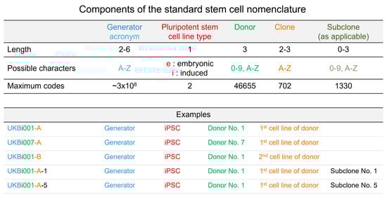 - Kurtz, A.; Seltmann, S.; Bairoch, A.; Bittner, M.-S.; Bruce, K.; Capes-Davis, A.; Clarke, L.; Crook, J.M.; Daheron, L.; Dewender, J.; et al. A Standard Nomenclature for Referencing and Authentication of Pluripotent Stem Cells. Stem Cell Rep. 2018, 10, 1–6. [Google Scholar] [CrossRef]