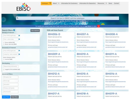 The EBiSC catalogue (https://ebisc.org/search) fed by the EBiSC IMS has different entry points to enable cell line discovery: (1) general full-text search; (2) the filtering of cell lines via a select list of data elements; (3) predefined cell line collections, including relevant controls (https://ebisc.org/collections); (4) a list of cell lines with similar properties like the cell line the user is currently viewing, for example, if this line is out of stock. These functionalities aim to ease finding cell lines of interest in a rapidly growing and diversifying collection and are steadily extended to adapt to user needs.