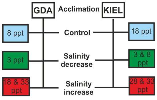 The live fish were transported in containers with sea water to the marine station of the University of Gdańsk in Hel, and then divided into two 2000 L tanks filled with recirculated water. The fish were kept at a constant temperature (10 °C), in a natural photoperiod, and under salinity conditions similar to those of the collection sites (GDA—8 ppt; KIEL—18 ppt). They were fed fresh herrings once a day and acclimated for more than 14 days until their typical behavior was restored. Next, fish from each localization were randomly divided and transferred to separate tanks termed control, salinity decrease, and salinity increase groups, and again acclimated as described above (Figure 2). The control tanks represented the natural salinities of the geographic region (abbreviated as GDA8 and KIEL18). During the osmotic challenge, the salinity was gradually changed (1 ppt per hour) in order to exclude acute stress and was measured every hour with a conductometer (Elmetron, Zabrze, Poland) [32]. In the increase group, salinity was elevated by 10 ppt and to 33 ppt in the GDA and KIEL groups (abbreviated as GDA18, GDA33, KIEL28, and KIEL33; Figure 2) by adding aquarium ocean salt (Aquarium Systems, Sarrebourg, France). In other tanks, salinity decreased by 10 ppt in the KIEL group (KIEL8) and to 3 ppt in both the GDA and KIEL groups (GDA3 and KIEL3). In experimental tanks, individuals were collected after 1 h, 12 h, and 72 h after reaching the desired salinity level (Figure 2). The fish were anesthetized using tricaine methanesulfonate (MS222) and sacrificed via spinal cord dissection, and their weights and lengths were measured.