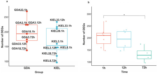Number of DEGs in the each experimental group. The Gulf of Gdańsk (GDA) represents EBC; the Kiel Bight (KIEL) represents WBC. (a) Number of DEGs in each experimental group. (b) No. of DEGs in time course. An asterisk represents a p-value < 0.05.