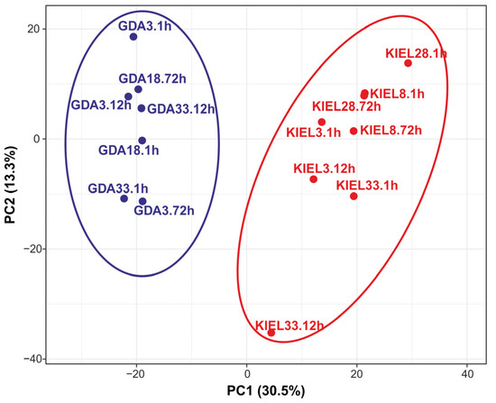 The principal component analysis (PCA) performed for all identified DEGs from this study showed a clear division of the GDA and KIEL groups (Figure 6).