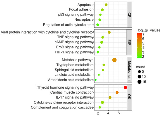 Bubble plot of pathway enrichment analysis using subpopulation-dependent genes. The plot presents the top five pathways, with the highest p-value divided into the main KEGG categories. CP: cellular processes; EIP: environmental information processing; and OS: organismal systems.