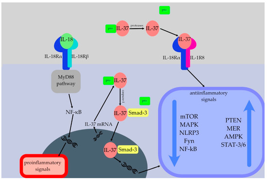 The described interplays are required to activate several intracellular switches that inhibit inflammation. IL-37 leads to the suppression of inflammatory pathways such as mammalian target of rapamycin (mTOR) and mitogen-activated protein kinase (MAPK), as well as NF-κB and various transcription factors [2]. Furthermore, IL-37 leads to activation of signal transducer and activator of transcription (STAT)3, protein phosphatase and tensin homolog (PTEN), and 5′AMP-activated protein kinase (AMPK) [2].