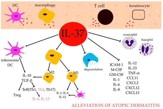 The expression of Mex3 RNA-binding family member B (Mex3B), which is an RNA-binding protein and coreceptor of Toll-like receptor (TLR) 3, was downregulated by IL-37. Consequently, IL-37 suppressed the synthesis of thymic stromal lymphopoietin (TSLP) in nasal epithelial cells, which consequently alleviated eosinophilic inflammation in an in vivo mouse model [55]. There is a body of evidence indicating that TSLP can activate DCs and mast cells, leading to the induction of Th2-type immune responses, and it is increasingly suggested that TSLP may be considered an important molecular player in the pathophysiology of AD.