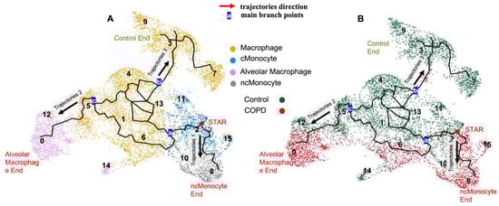 Pseudo-time trajectories projected on a UMAP graph. (A) Cells are colored according to the cell types. Non-classical (nc) monocytes are colored grey in Clusters 8 and 10; classical (c) monocytes are colored sky blue in Clusters 2, 11, and 15; macrophages are colored orange in Clusters 1, 4, 5, 6, and 13 in the middle area and Clusters 3, 7, and 9 in the upper area; and alveolar macrophages are colored pink in Clusters 0, 12, and 14. (B) Cells colored according to the disease status (i.e., COPD/control). Control cells are in green, and COPD cells are in red. Three different trajectories were inferred. The green and red arrows indicate the directions of the three different trajectories. The labels a, b, and c represent three main branching points in these trajectories.