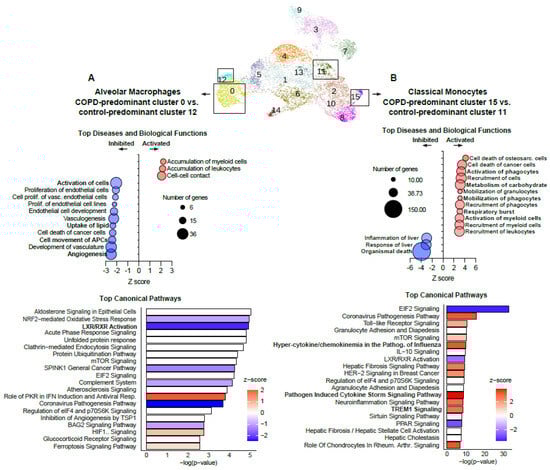 Top downstream diseases and biological functions and canonical pathways from COPD-predominant vs. control-predominant clusters predicted using Ingenuity Pathway Analysis. (A) Downstream diseases and biological functions (top) and canonical pathways (bottom) of differentially expressed genes in FCN1-high alveolar macrophages from the COPD-predominant Cluster 0 vs. the control-predominant Cluster 12 (n = 176, Padj < 0.05, |log2FC| > 0.5). (B) Downstream diseases and biological functions (top) and canonical pathways (bottom) of differentially expressed genes in classical monocytes from the COPD-predominant Cluster 15 vs. the control-predominant Cluster 11 (n = 495, Padj < 0.05, |log2FC| > 0.5).