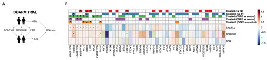 Validation of the IPA-predicted fluticasone genes in DISARM. (A) A graphical summary of the DISARM trial. Patients with stable COPD underwent bronchoscopy and a BAL procedure before treatment, with the patients having been free from inhaled corticosteroids for at least 4 weeks. One week later, the patients were randomized to three arms and treated with (1) salmeterol/fluticasone (SAL/FLU), (2) formoterol/budesonide (FOR/BUD), or (3) FOR for 3 months. Another BAL sample was taken at the end of the treatment period. (B) Heat map of the changes in gene expression (median post-treatment minus pre-treatment log2 counts per million (Δlog2CPM)) in each treatment group. * represents Wilcoxon’s signed rank test p-value < 0.05, and color represents the median Δlog2CPM. Genes were arranged according to their significance in the SAL/FLU group. The top rows contain annotated genes that were predicted to be regulated by fluticasone by IPA from each single-cell comparison.
