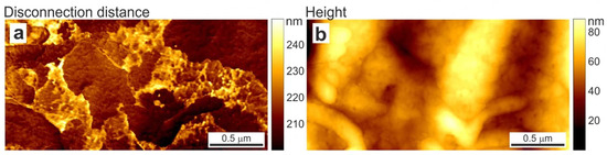 Distribution of (a) disconnection distance obtained in new AFM ringing mode and (b) height signal simultaneously recorded in peak force tapping mode on A375 human melanoma skin epithelial cells. Taken from [45] under Creative Commons license.