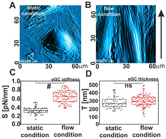 Comparison between morphological and nanomechanical properties of endothelial cells grown in static and flow conditions. (A,B) AFM images of cells, (C) glycocalyx stiffness, and (D) glycocalyx thickness. Statistics: (#) different at p = 0.05, (ns) non-significant. Modified from [60].
