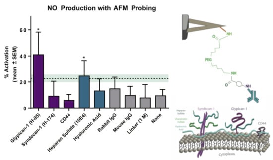 The glycocalyx plays a significant role in the signaling pathways of endothelium NO regulation. It is known that the degradation of the glycocalyx layer leads to a dramatic reduction in NO production by endothelial cells. However, the specific components of the endothelial glycocalyx involved in this response are not clearly established. The authors of [61] used an AFM cantilever tip modified with specific antibodies to selectively pull individual proteoglycans or glycosaminoglycans and detect changes in intracellular NO production. A sharp pyramidal tip was used to measure the adhesion forces of individual molecules, while tipless cantilevers were used to engage a potentially large area in the activation of NO production. In contrast, to measure the Young’s modulus, the retractive portion of the force curve was used. The mean adhesion forces for glypican-1, syndecan-1, CD44, heparan sulfate, and hyaluronic acid occurred in the range of 100–300 pN. The AFM pulling of glypican-1 and heparan sulfate for 10 min caused significantly increased NO production, whereas pulling on syndecan-1, CD44, and hyaluronic acid and with control probes did not (Figure 5).