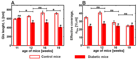 Comparison between glycocalyx length (A) and effective coverage (B) of endothelial cells in ex vivo mouse aorta with diabetes progression. Statistics: (*) p < 0.0001; (ns) non-significant. Modified from [62].