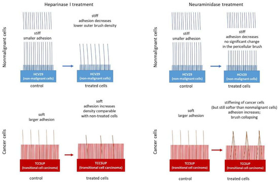 Schematic representation of the differences in the structure of the pericellular layer of nonmalignant and cancerous cells and their changes after enzymatic treatment. Taken from [64] under Creative Commons license.