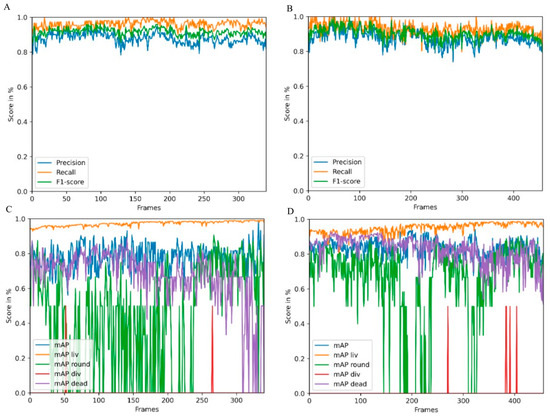 For the mAP score, the class labels of the boxes were also taken into account when assigning the boxes as true positives, false positives, and false negatives. Now, only boxes are true positive if the box overlaps with an IoU > 0.5 with a groundtruth box and the label is the same. If the label does not match the label of the corresponding groundtruth box, the box is false positive. The boxes were sorted according to their confidence score that was assigned by the object detector, starting with the highest confidence score and going to boxes with smaller scores. The precision and the recall were calculated by taking only the current box and all boxes with a higher confidence score as one of the current boxes into account. This is repeated for all boxes, and in every step, one more box is taken into account. The average precision is the area under the resulting recall-precision curve. The mean average precision score was calculated for each class individually as the mean of the average precision for IoU < 0.5 (mAP liv, mAP round, mAP div, and mAP dead). If a class did not appear in the predictions and the groundtruth, it was assigned a mAP score of 0. The overall mAP was defined as the average of all classes present in each frame.