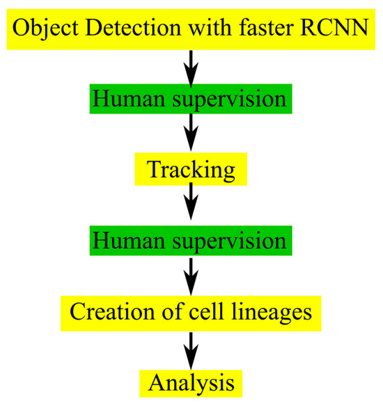 After object detection was performed for each frame, centroid tracking was applied as described in the Section 4. The accuracy of tracking was tested by comparing the tracking IDs predicted from the CeCILE 2.0 centroid tracker with tracking IDs from a manually labeled groundtruth on groundtruth bounding boxes in the two test videos. In the irradiated video, 97.77% (30,427 out of 31,120) of tracking cases were correct, and in the sham irradiated case, 98.51% (26,544 out of 26,946). This method can very well track the movement of cells but is not able to identify a cell division and assign two daughter cells to a mother cell. Therefore, to correct for incorrect classification, a manual supervising step is implemented in the CeCILE 2.0 workflow. The correction steps are implemented between object detection and tracking and after tracking. This allows the user to manually correct the bounding boxes, box labels, and box IDs, ensuring 100% accuracy in the classification and tracking through several cell cycles. As a final step, cell lineages for each cell and its descendants are created. A schematic sketch of the current workflow is shown in Figure 2.