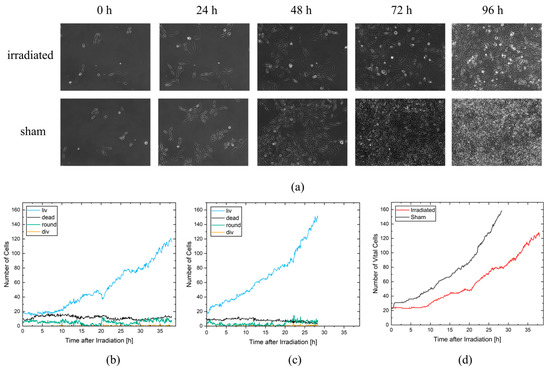(a) Phase-contrast images of the irradiated and non-irradiated sham cell population. (b) Number of cells per class for the non-irradiated sham cell population. (c) Number of cells per class for the irradiated cell population. (d) Comparison of all vital cells for irradiated (red) and non-irradiated sham (black) cell populations.