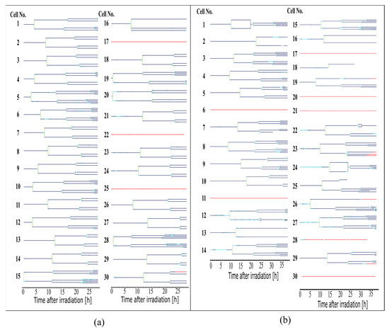 Cell lineages of all cells evaluated in the sham-irradiated control (a) and the 3 Gy X-ray-irradiated sample (b). Lines in the lineages appear dark blue for living cells, light blue for round cells, green for dividing cells, and red for dead cells. Black connections between two cells indicate a fusion of the membranes of two connected cells.